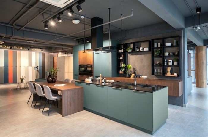 Không gian bếp kết hợp nhiều màu gỗ laminate đơn sắc tại showroom An CườngĐây là bộ sưu tập gỗ laminate được áp dụng các công nghệ tiên tiến hiện nay với hiệu ứng bề mặt mềm và mịn như lụa, không bám dấu vân tay, khả năng chống trầy xước cao và đặc biệt là khả năng phục hồi bề mặt hư hỏng.