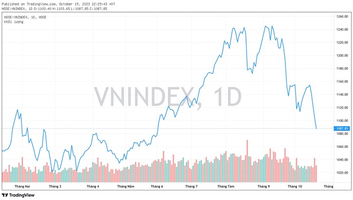 VN-Index tiếp nối chuỗi 4 phiên giảm điểm liên tiếp với biên độ giảm mỗi phiên đều trên 1%. Những nhịp lao dốc mạnh khiến thị trường chính thức “thủng” mốc 1.100 điểm để về mức thấp nhất trong hơn 4 tháng qua. Đây cũng là chuỗi giảm giá sâu nhất của VN-Index kể từ thời điểm cuối năm 2022.