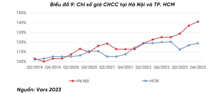 Trong quý 4/2023, giá căn hộ chung cư sơ cấp trung bình tại Hà Nội là 51,7 triệu đồng/m2 và TP.HCM là 71 triệu đồng/m2.. Mặt bằng giá căn hộ chung cư sơ cấp khó giảm do chi phí đầu vào, lạm phát, lãi suất ngày càng tăng cao. Trong khi số lượng dự án nhà ở thương mại được phê duyệt mới ngày càng khan hiếm, quỹ đất tại các khu vực trung tâm cũng không còn nhiều.