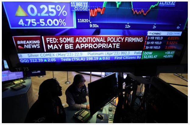 Chứng khoán sụt giảm vào thứ Tư khi Fed tiếp tục tăng lãi suất thêm 0,25%, đồng thời thừa nhận tình trạng hỗn loạn trong lĩnh vực ngân hàng có thể làm chậm lại nền kinh tế vốn đã mong manh. Cổ phiếu ngân hàng đã trượt dốc khá nhiều sau bình luận này.