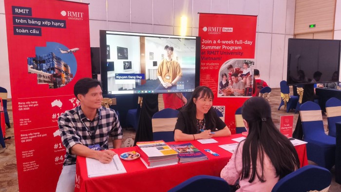 Đại diên RMIT Việt Nam tư vấn tại sự kiệnBà Nguyễn Đặng Bình An, Tư vấn tuyển sinh Chương trình Tiếng anh cho Teem tại Khoa Tiếng anh và chuyển tiếp đại học – RMIT Việt Nam cho hay, khi nhận được lời mời tham gia sự kiện GFF của các đơn vị tổ chức, chúng tôi rất vui vì hiện tại nhà trường cũng có một số chương trình để quảng bá. “Hiện tại chúng tôi đang giới thiệu cách chương trình học tiếng anh dành cho học sinh từ 12 đến 17 tuổi, đây là chương trình 4 tuần hè bán trú tại nhà trường, ngoài để cho các bạn nhỏ ngoài bồi dưỡng thêm tiếng anh thì các bạn còn được trải nghiệm về nhà trường nhiều hơn”, bà Nguyễn Đặng Bình An chia sẻ.