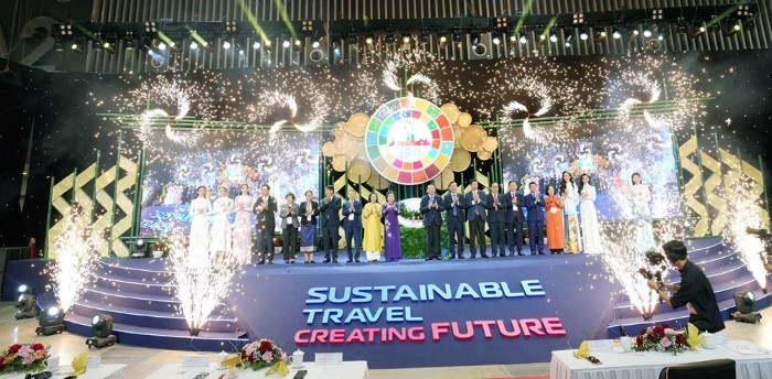 Các đại biểu thực hiện nghi thức khai mạc Hội chợ ITE HCMC 2024Phát biểu khai mạc, ông Nguyễn Văn Dũng, Phó Chủ tịch UBND TP.HCM cho biết, với chủ đề “Du lịch bền vững – Kiến tạo tương lai”, hội chợ kỳ vọng các quốc gia, khu vực, vùng lãnh thổ, các chính quyền và doanh nghiệp tiếp tục theo đuổi mục tiêu phát triển bền vững, xây dựng và triển khai thực hiện một cách nhanh chóng, quyết liệt, hiệu quả các kế hoạch phát triển du lịch bền vững và cùng chung tay hướng đến giảm phát thải trên toàn cầu, bảo vệ các nguồn tài nguyên thiên nhiên, bảo vệ môi trường sống và môi trường văn hoá vì thế hệ hôm nay và mai sau.