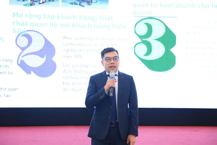Ông Ngô Bình Nguyên – Giám đốc phân khúc hộ kinh doanh, Ngân hàng TMCP Việt Nam Thịnh Vượng (VPBank) chia sẻ tại hội thảoTiếp nối các giải pháp số của MISA, ông Ngô Bình Nguyên – Giám đốc Phân khúc Hộ kinh doanh VPBank đã giới thiệu về các giải pháp tài chính phù hợp dành riêng cho hộ như gói vay V20K với lãi suất ưu đãi chỉ từ 3,99%/năm cho khoản vay thế chấp, hạn mức vay lên tới 20.000 tỷ đồng, hay mở thẻ tín dụng VPBank CommCredit với mức hoàn tiền lên tới 12%, hay các giải pháp tích luỹ sinh lời với lợi suất hấp dẫn lên tới 4,5% từ công cụ Super Sinh lời, đặc biệt phù hợp cho các khách hàng có dòng tiền nhàn rỗi trong ngắn hạn.