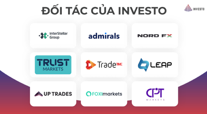 Với kinh nghiệm lâu năm trong nghề, Investo tự hào khi được các đối tác đặt niềm tin tưởng và đặt trước các gói giải pháp quảng cáo thương hiệu xuyên suốt trong năm. Một số đối tác uy tín là những “ông lớn" trong ngành mà Investo có cơ hội hợp tác có thể kể đến như: Admirals, TradeTIME, NordFX, Leap, CTP, FOXI Market, Trust Market, DOTO,...