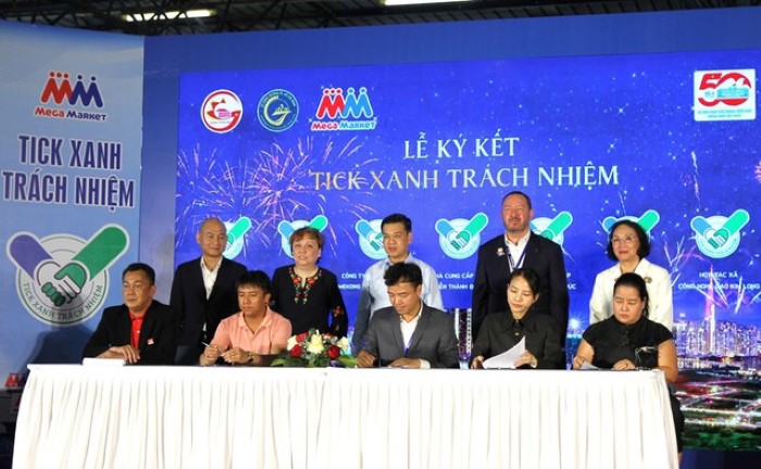 Các bên thực hiện lễ ký kết chương trình "Tick xanh trách nhiệm".Có 7 nhà cung cấp tham gia ký kết lần này, trong đó phần lớn là các đơn vị sản xuất thực phẩm, rau củ như Công ty TNHH Thaicorp International Việt Nam, tổ hợp tác rau an toàn Nguyễn Thành Đạt, HTX nông nghiệp Kim Long - sản phẩm dưa lưới...