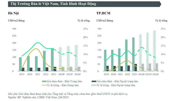 Tại Hà Nội, giá thuê tầng trệt tại khu vực trung tâm ở mức 162 USD/m2/tháng, tăng 13% so với năm trước. Còn ở TP.HCM, giá thuê trung bình khu vực trung tâm gần ngưỡng 240 USD/m2/tháng, tăng 6% so với năm trước. Hầu như không có diện tích bán lẻ trống tại khu vực trung tâm ở cả hai thành phố.