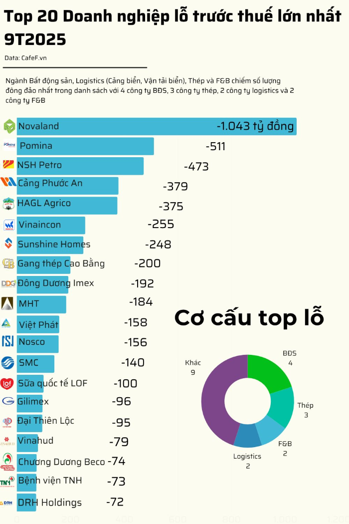 Nhìn vào cơ cấu ngành, bất động sản là nhóm đóng góp nhiều đại diện nhất trong top thua lỗ với 4 công ty. Nhóm thép có 3 đại diện là Pomina, Gang Thép Cao Bằng và Đại Thiên Lộc. Nhóm Logistics (Vận tải biển, Cảng biển) có 2 cái tên là Cảng Phước An (PAP), Nosco (NOS). Nhóm F&B cũng có 2 đại diện là Sữa Quốc tế LOF và Chương Dương Beco.