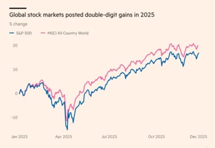 Thị trường chứng khoán toàn cầu đã vượt qua những biến động do cuộc chiến thương mại và nỗi lo về bong bóng trong lĩnh vực trí tuệ nhân tạo để ghi nhận năm thứ ba liên tiếp tăng trưởng ở mức hai con số vào năm 2025.